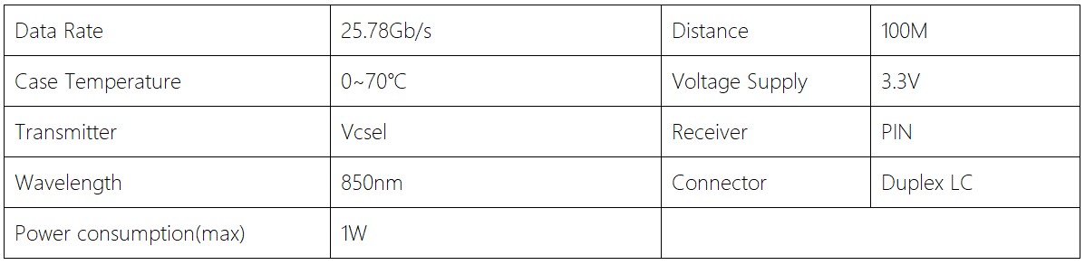25G SFP28 SR transceiver modules are designed for use in 25 Gigabit Ethernet links on up to 100m of Multi mode fiber. They are compliant with the SFP MSA and IEEE 802.3by. The optical transceiver is RoHS compliant.